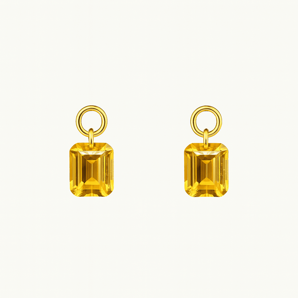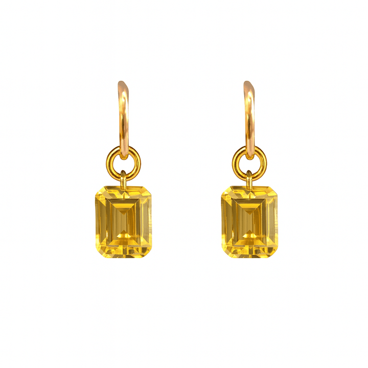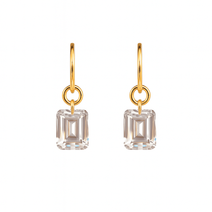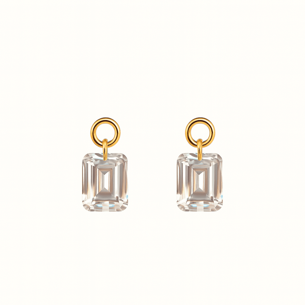 Each charm features a hand-cut, emerald-shaped stone suspended from a polished golden ring. The design is minimal yet radiant, catching light with every turn. Slide them onto your favorite endless hoops or select the complete pair to wear right out of the box.