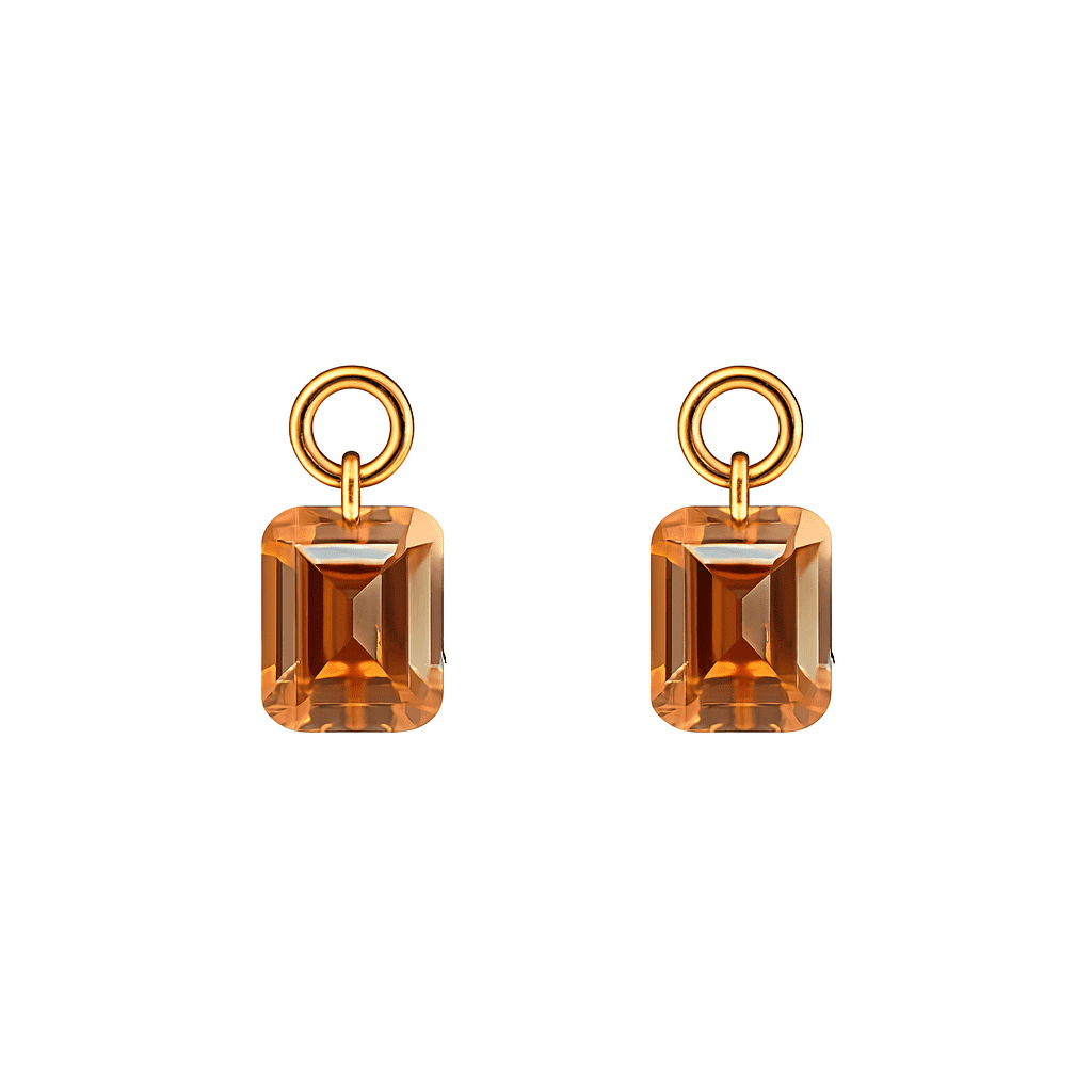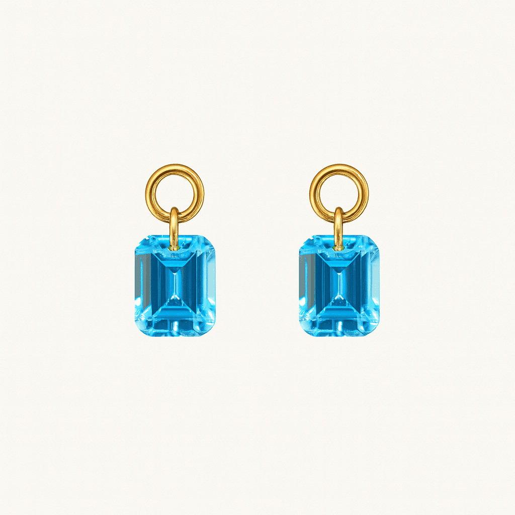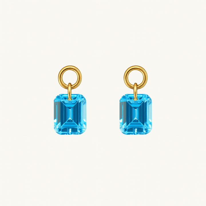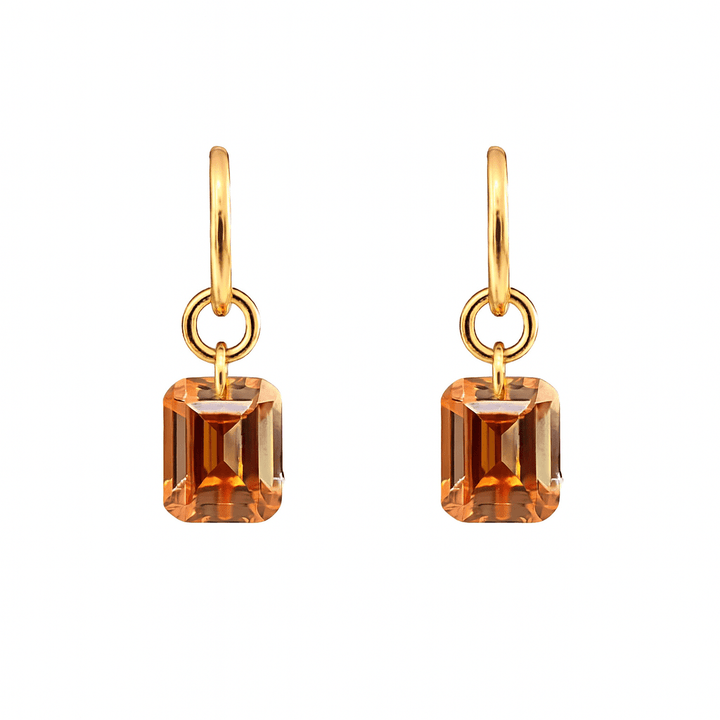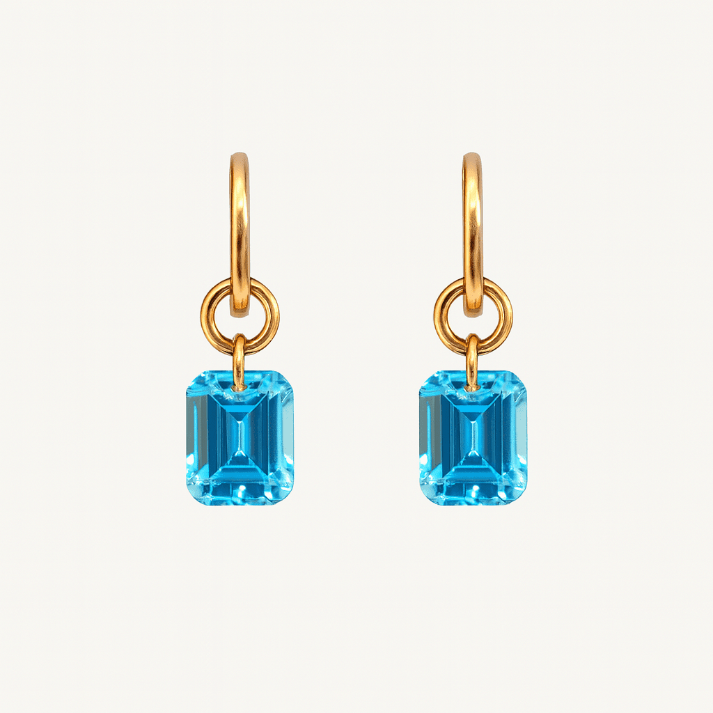 Each charm features a hand-cut, emerald-shaped stone suspended from a polished golden ring. The design is minimal yet radiant, catching light with every turn. Slide them onto your favorite endless hoops or select the complete pair to wear right out of the box.