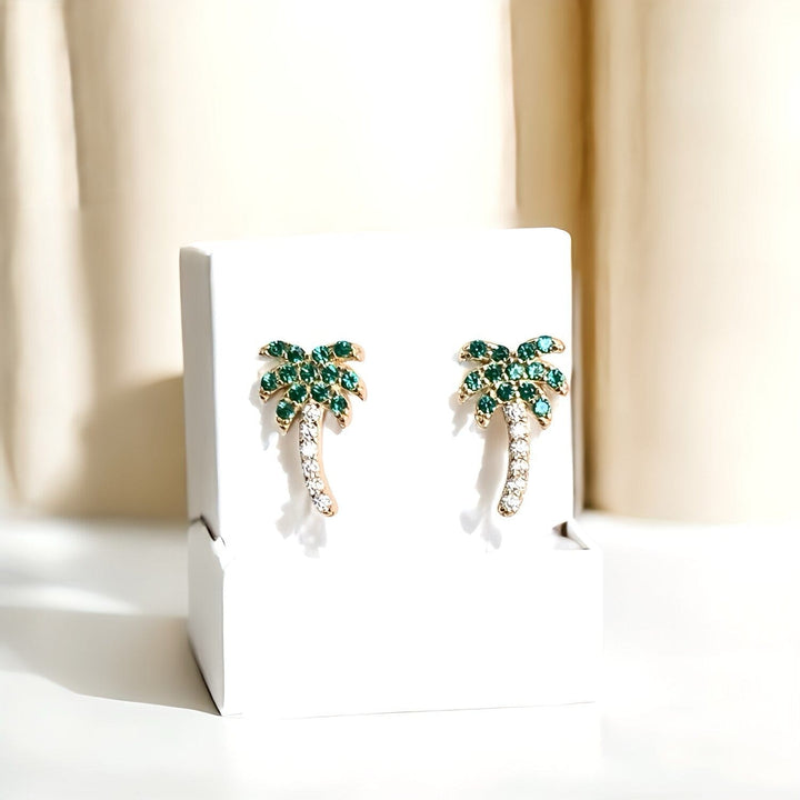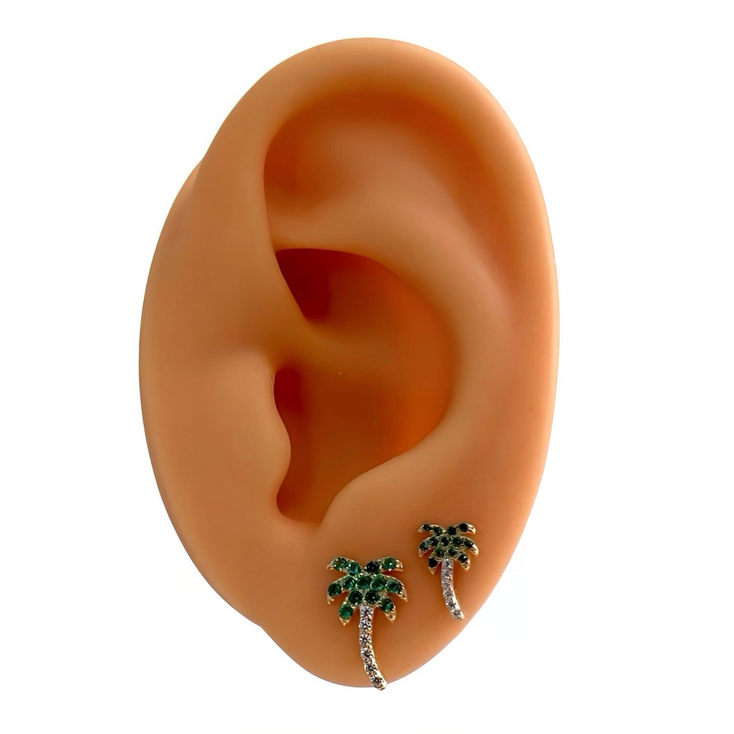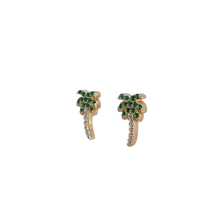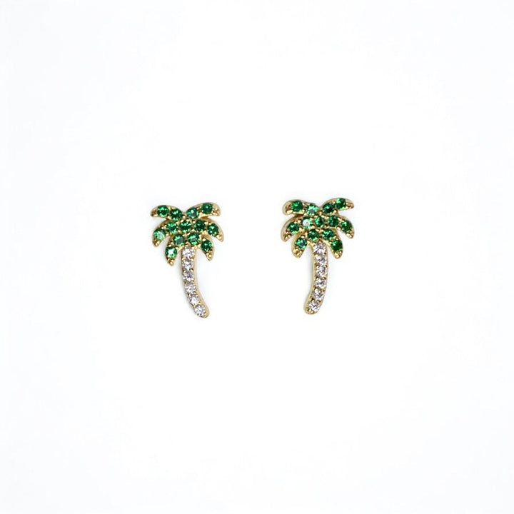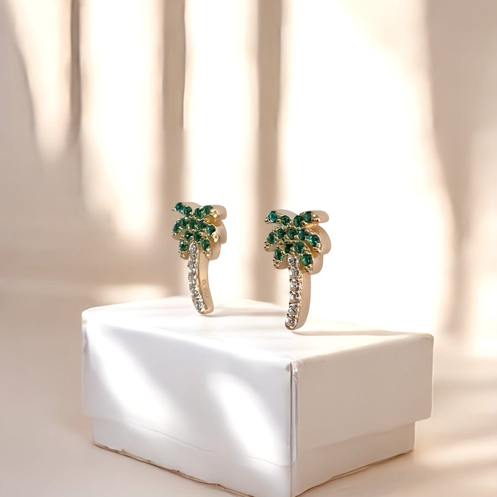 Mini Palm Tree Stud Earrings – Dainty Sterling Silver with Man-Made Diamonds and Green Spinel